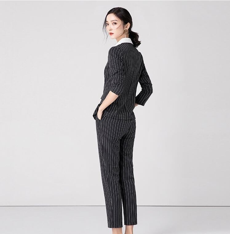 黒地に白のストライプが縦長に見せ、細身のパンツでさらに着痩せ効果を発揮できるデザイン。