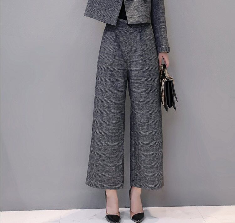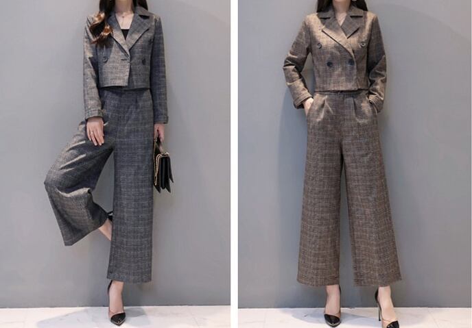 ショート丈のジャケットとワイドパンツでバランスよく見えるセットアップです。