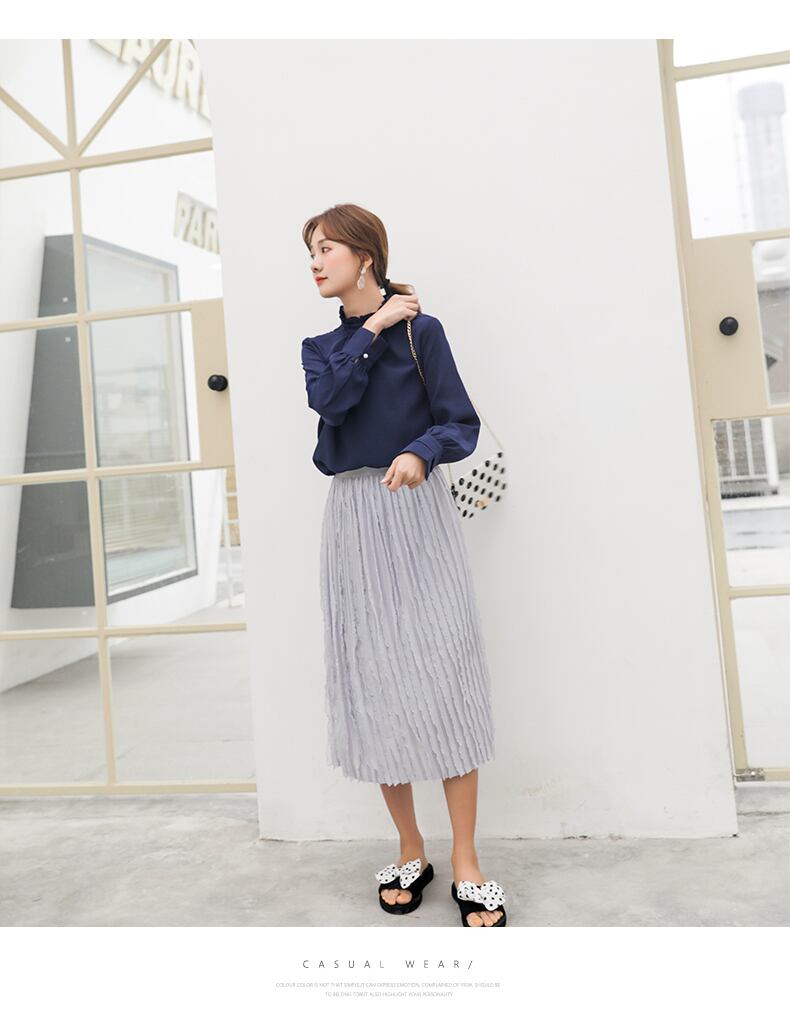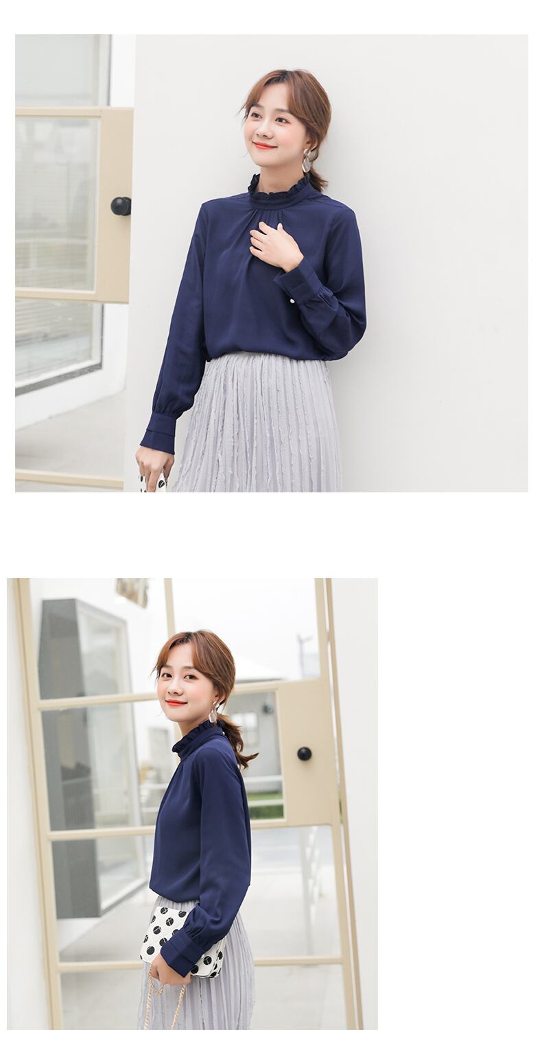 襟元の小さなフリル、袖のパールボタンとデザインで女性らしさを演出。