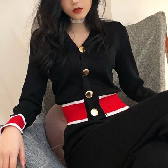 カーディガンには袖口、ウエストに赤いラインが入っていています。