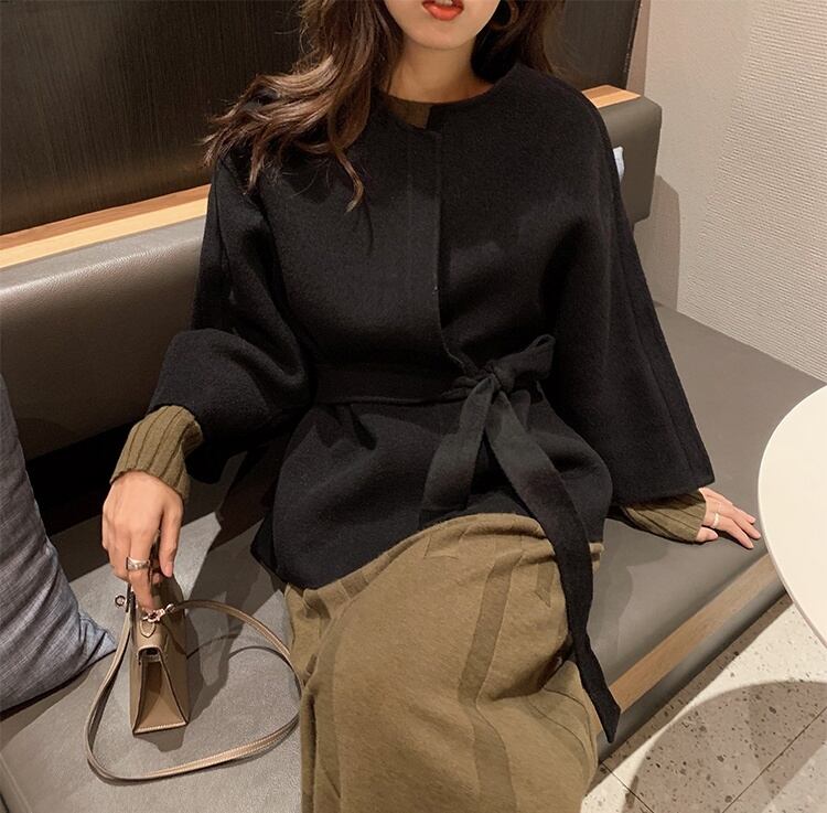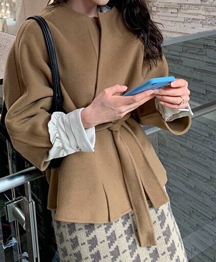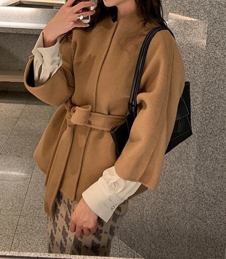 ノーカラーで首元がすっきりと見え、冬場はマフラーも合わせやすく、タートルネックとも好相性◎